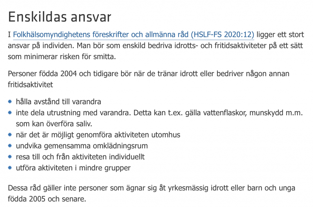 Onsdagen den 13/1 fick vi ett muntligt besked från Länsstyrelsen i Sörmland att vi med vår kursverksamhet inte påverkas av den nya pandemilagen. Nu har även Riksidrottsförbundet kommit med klara besked, se nedan.