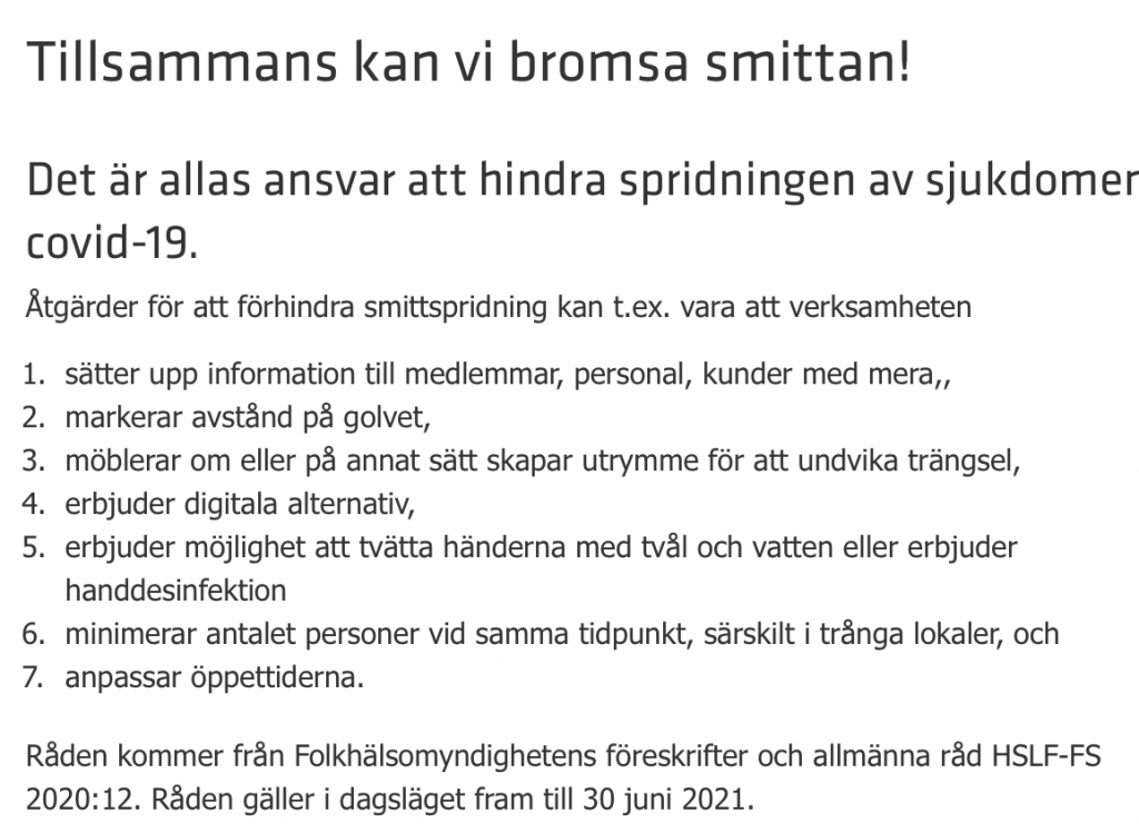I övrigt gäller Folkhälsomyndighetens restriktioner. Se info nedan